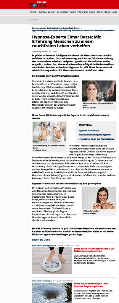 Ich arbeite seit vielen Jahren als Hypnosetherapeut in Hamburg und begleite Menschen dabei, dauerhaft rauchfrei zu werden. Mein Name ist Dr. phil. Elmar Basse, Heilpraktiker für Psychotherapie, spezialisiert auf Tiefenhypnose.